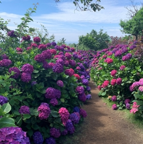 해안도로를 따라 펼쳐지는 7만 송이의 수국 군락지! 바다와 함께 수국을 즐길 수 있어 사진 맛집으로도 유명합니다.